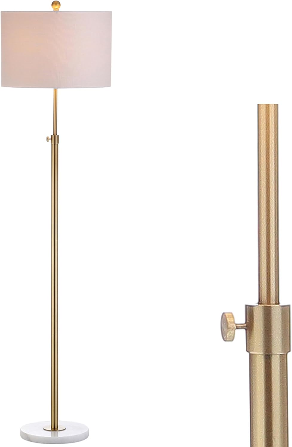 A sleek floor lamp with a slender brass body and heavy marble base, topped with a fabric drum shade—combines form & function.